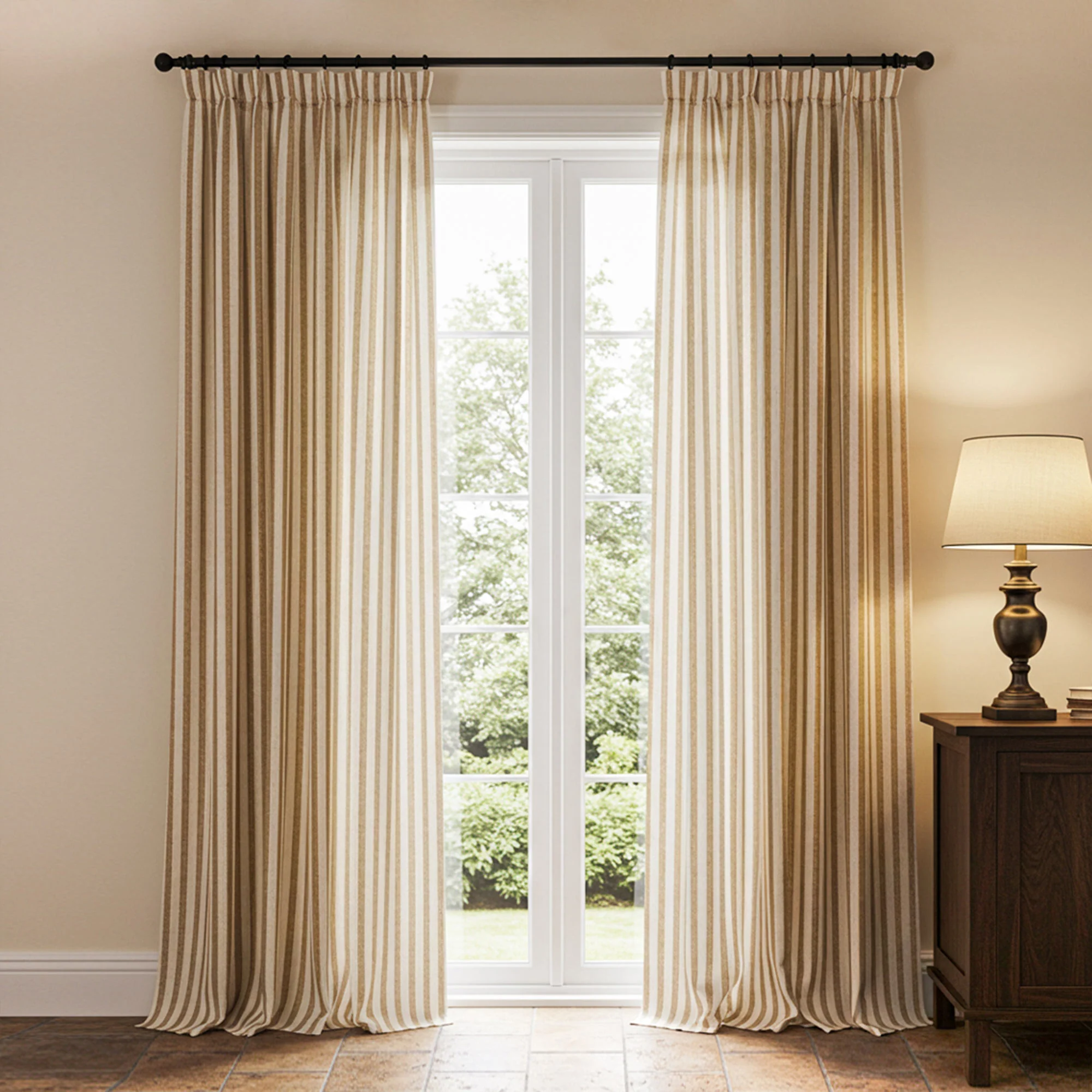 Pairing natural cotton curtains with wooden rods creates an organic, cozy atmosphere.