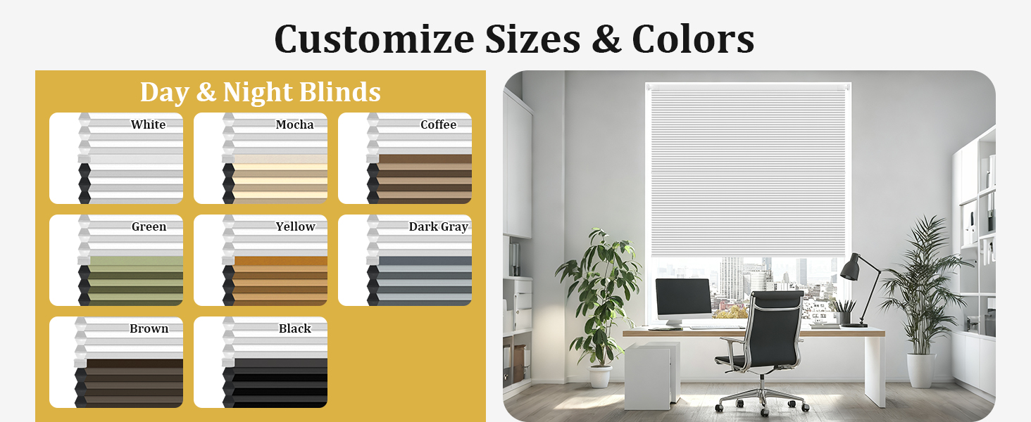 One shade, two modes. Our innovative Day & Night (dual-layer) honeycomb shades combine a light-filtering layer with a full blackout layer. With a simple pull, instantly switch between soft, diffused daylight and total privacy for rest.