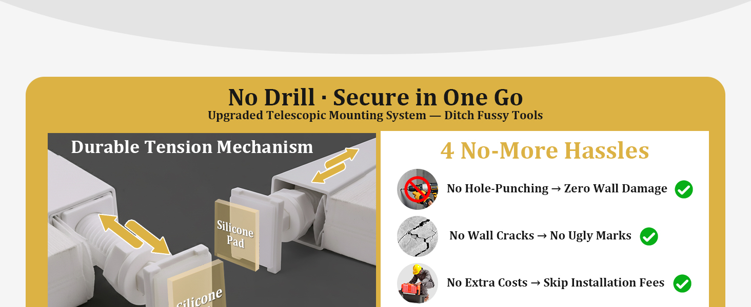 Enjoy hassle-free setup with our no-drill installation system. The shades feature a sturdy, color-matched triple-track aluminum frame, supporting a clean and modern flat design that integrates seamlessly with your windows.
