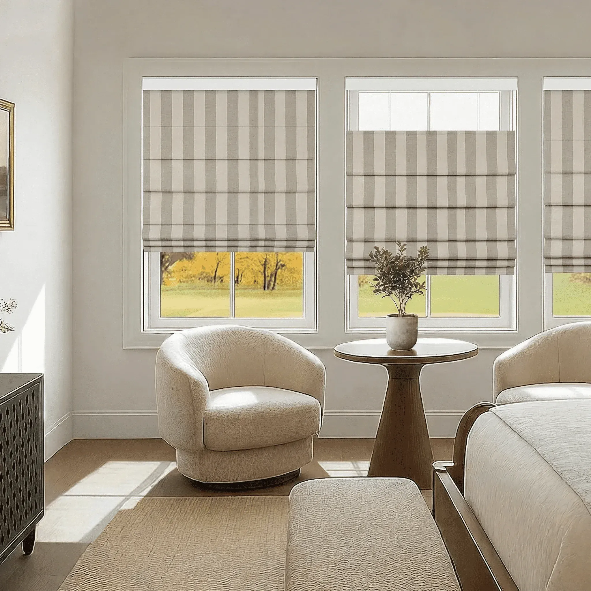 inCustom top down bottom up roman shades are made of high-quality natural linen fabric, featuring an elegant stripe design for enhanced aesthetic appeal. It supports customization of size, valance, semi-blackout and full-blackout lining. With dual-way adjustment, it achieves flexible light control and ideal privacy.