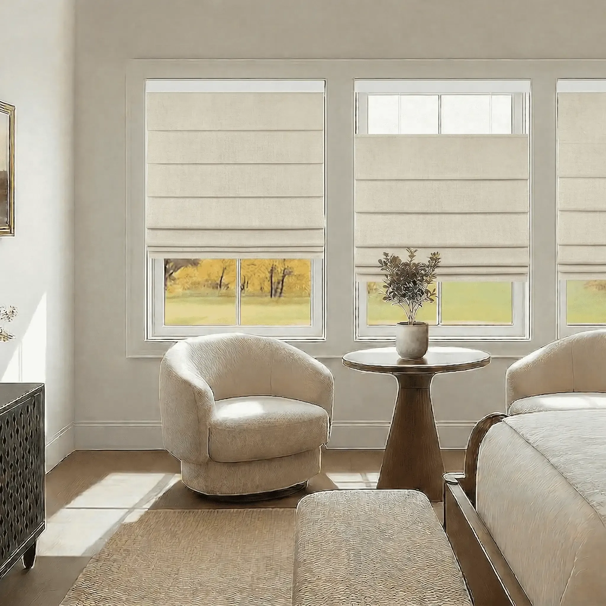 [Natural Linen Texture]Crafted from high-quality linen fabric, this roman blind features soft, elegant texture and excellent durability. It can be customized with semi-blackout or full-blackout lining to meet different shading and thermal insulation needs.