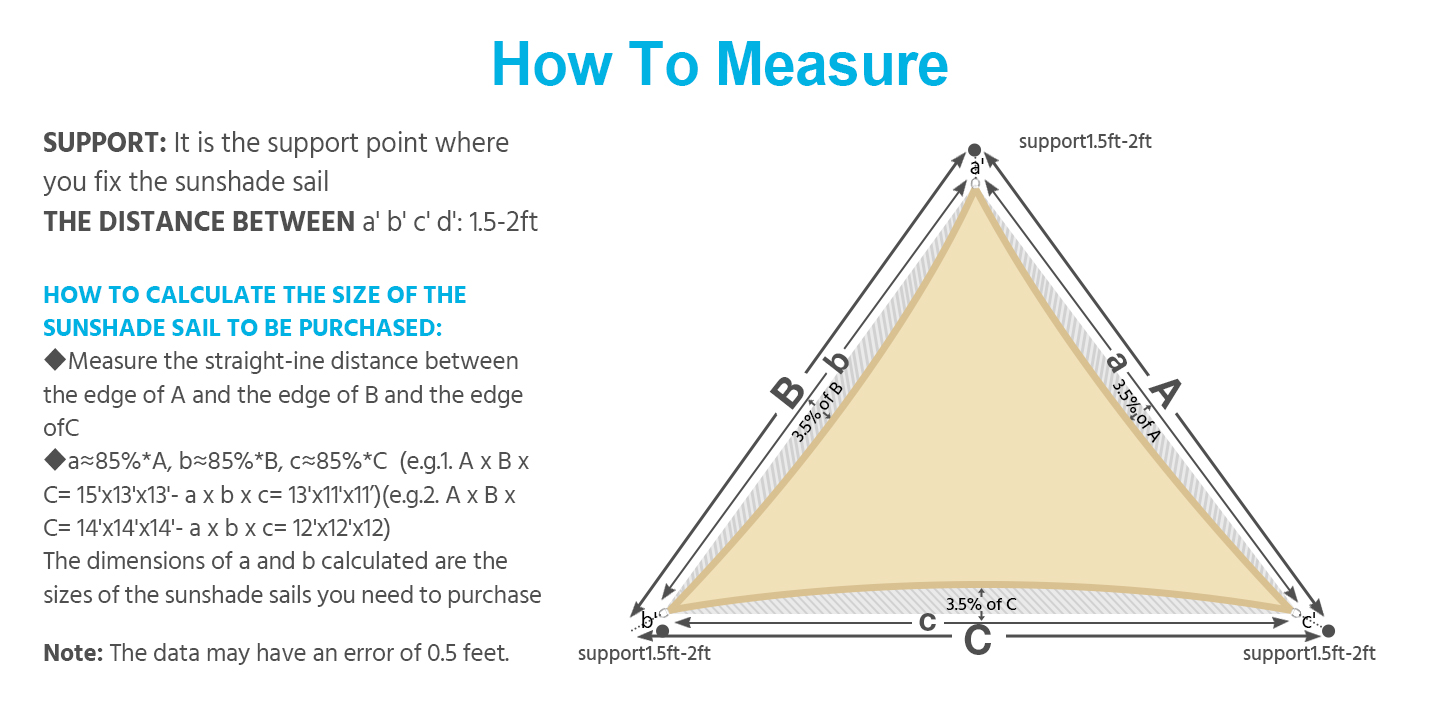 - Installation Guidelines: Measure from D-ring to D-ring; leave 1.5-2 feet for hardware between the sail's D-ring and mounting points; consider sizing sail at 88% of the installation area's dimensions to avoid sagging; hardware kit not included