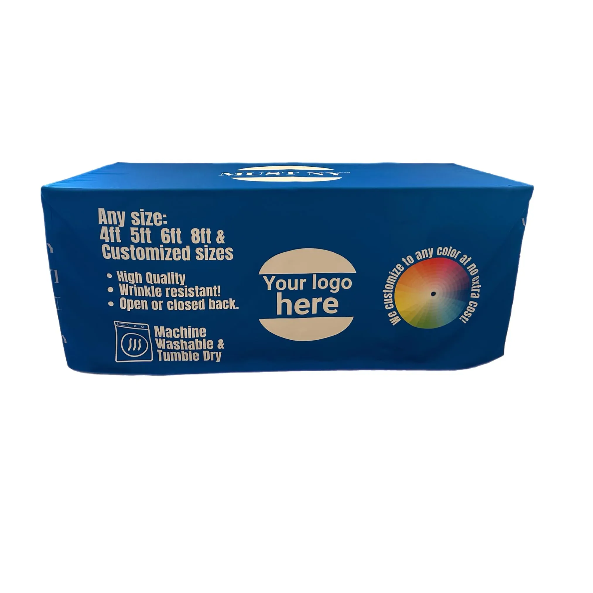 Polyester Custom Tablecloth with business logo are made from thick heavyweight for high-quality. Tablecloth with sublimation printing for exceptional color print is long-lasting and resists fading, preserving print lifetime. Customized tablecloth with logo. Optional back. Our creative team support with designs and can switch colors if required.